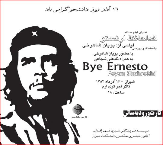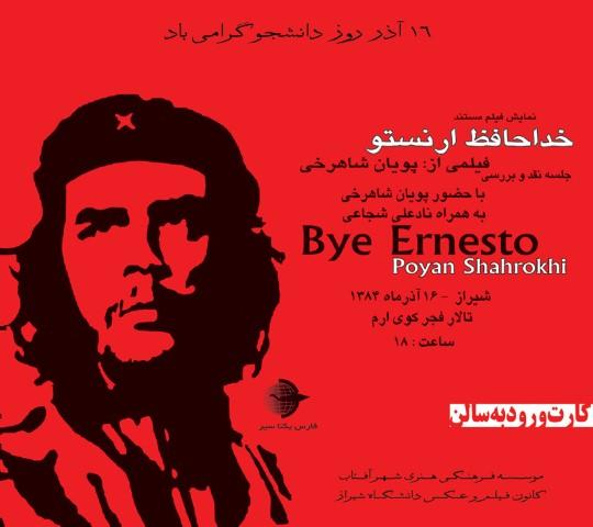 نمایش فیلم خداحافظ ارنستو به همراه نقد و بررسی فیلم با حضور کارگردان این فیلم جناب آقای پویان شاهرخی و آقای نادعلی شجاعی از سینماگران شیراز با حضور علاقمندان به سینمای مستند با نگاهی به زندگی ارنستو چگوارا برگزار گردید. این برنامه ۱۶ آذرماه ۱۳۸۴ در تالار فجر پردیس ارم دانشگاه شیراز برگزار گردید. این فیلم از ساختههای سینماگر جوان ایرانی است که توسط یک شرکت فرانسوی در کوبا تهیه گردیده است.